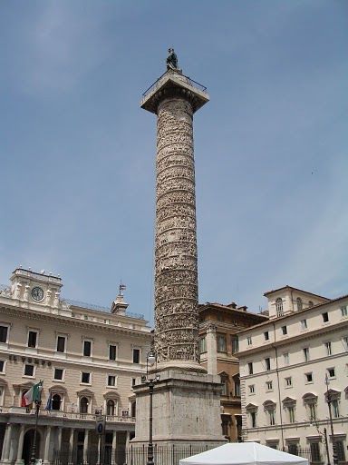 Coluna de Trajano. Localizada no fórum perto do monte Quirinal, a coluna tem aproximadamente 30 metros de altura mais oito metros de pedestal, perfazendo 38 metros de altura. Constituída por vinte blocos de mármore, cada um pesando 40 toneladas, e um diâmetro de quatro metros. No seu interior, uma escada em espiral com 185 degraus dá acesso à plataforma do topo, de onde se obtém uma vista periférica.