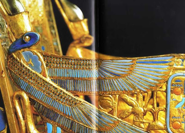 A representação completa é colocada abaixo da imagem protetora do disco solar que, sobre o casal, estende os seus raios que emanam vida. O restante do trono é caracterizado por um delicado entalhe e decorações em marchetaria, dispostos com cuidadoso equilíbrio cromático, como se vê nos braços,decorados com a figura de uma grande e elevada cobra alada que protege, diante de si, a cártula com o nome do soberano.