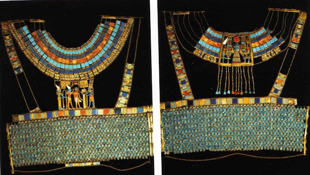 Uma das obras de ourivesaria mais elaboradas e suntuosas do enxoval de Tutankhamon é certamente o colete, que faz parte do traje de gala do jovem soberano. A jóia, prerrogativa de faraós e divindades, é formada por duas partes, unidas entre si com fechos que deveriam cobrir respectivamente o peito e as costas de Tutankhamon.